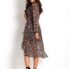 Ultra-feminine dress made of leopard print fabric with a very feminine envelope neckline with a pleat, forming the “V” shape. Lightness and boho notes add valance. Long sleeves with elastic at the bottom. It is a perfect proposition for informal meetings and everyday outings. Style the dress with heels, but also with boots for everyday style.