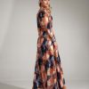 Maxi dress with a geometric pattern distinguished by a slit at the front that exposes the legs. The dress has a classic V-shaped neckline, long, traditional sleeves. A simple top with a delicate elastic band and ruffles at the waist emphasized by a wide skirt create a unique effect. Classic colors soothe the aggressiveness of the pattern and make the dress suitable for many occasions. With slippers on the post, it will be suitable for work or a family meeting.