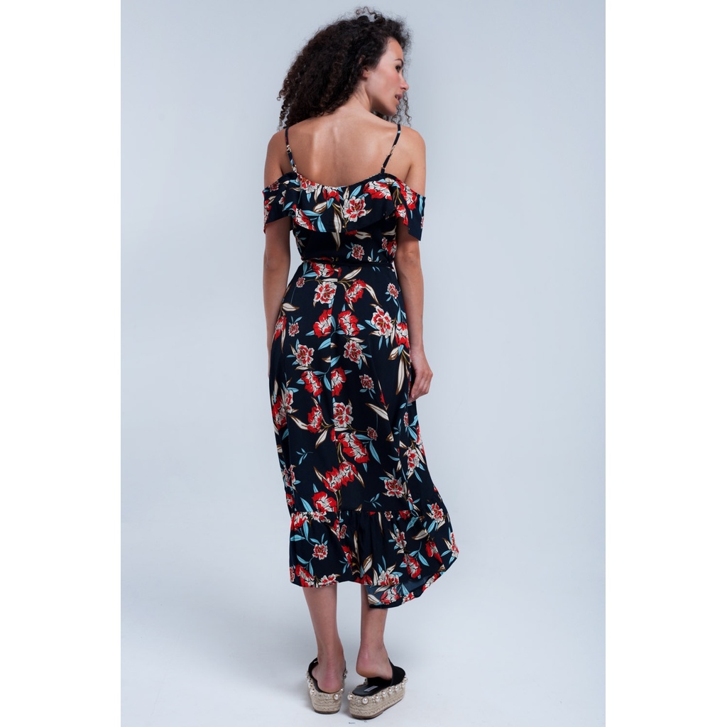 Beautiful asymmetric wrap dress printed flower in color navy with ruffles on the top and the bottom.