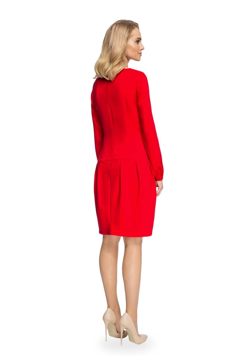 Flared red dress with a lowered waist line. Beautiful A-line dress with a v-neckline complete with long sleeves, which are finished with a mini cuff fastened with snaps. The flared bottom is emphasized by delicate pleats. Dress that you can use for many occasions and all family celebrations.