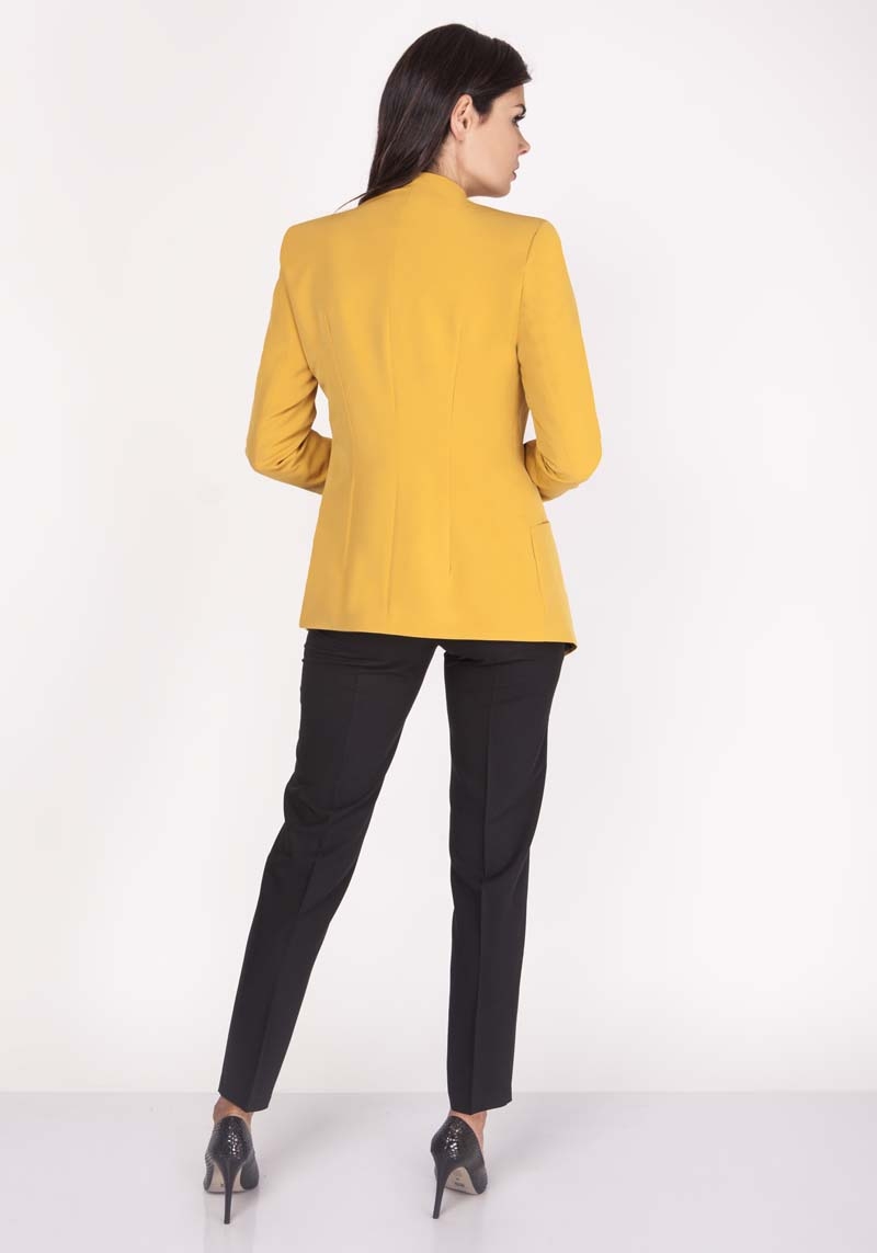 Our yellow blazer has a classic slightly fitted cut with a v-neckline that visually lengthens and slims the figure and can be styled with trousers, dress or skirt. This jacket is an imperishable classic that is the basic element of every woman’s wardrobe.